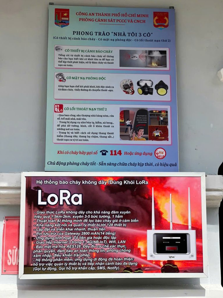 Biển thông báo về Phong Trào “Nhà tôi 3 có” tại khu vực mô phỏng hệ thống Báo cháy không dây/Dùng khói LoRa của Nexgen